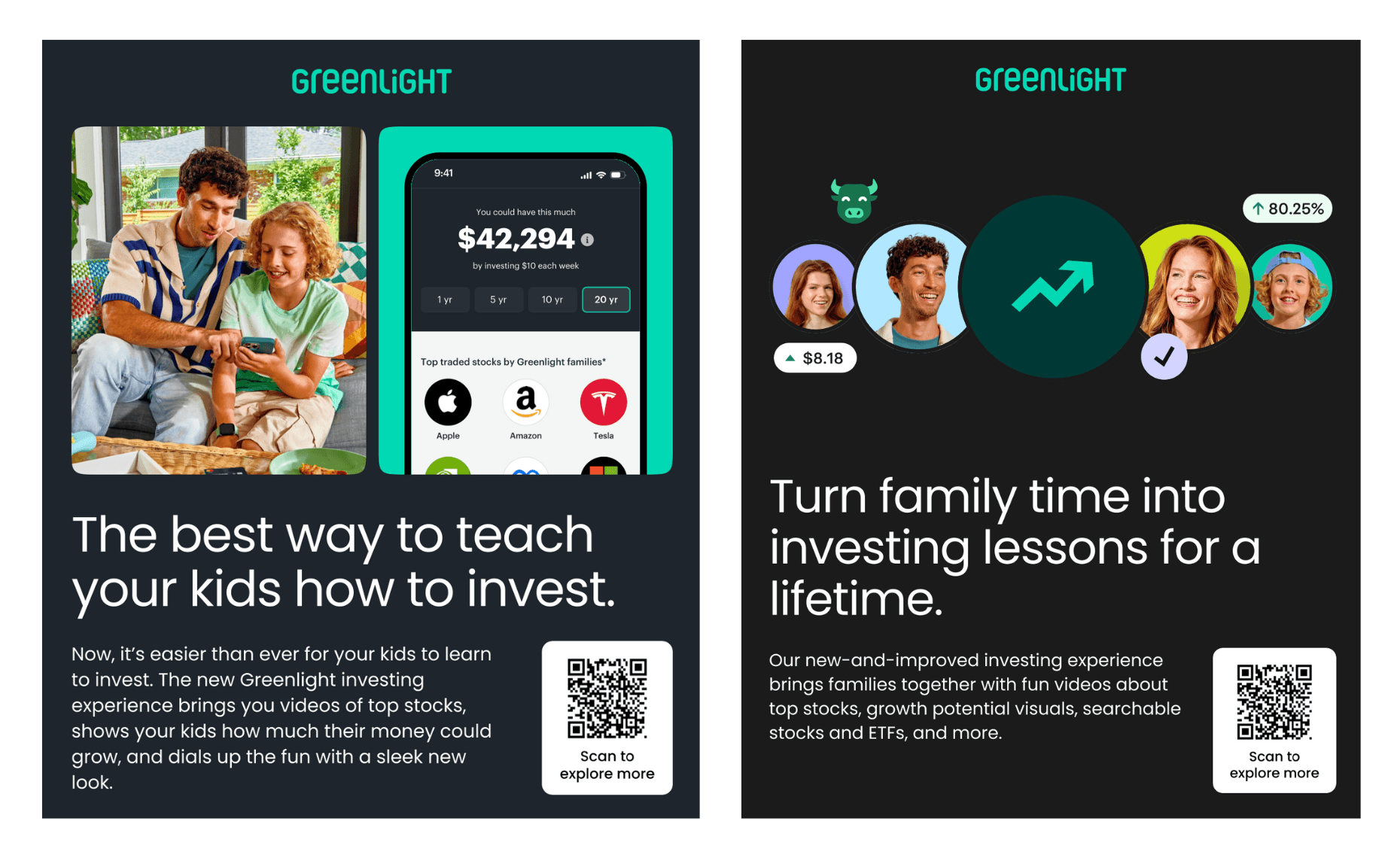 Test 1: "The best way to teach your kids how to invest." Test 2: "Turn family time into investing lessons for a lifetime."